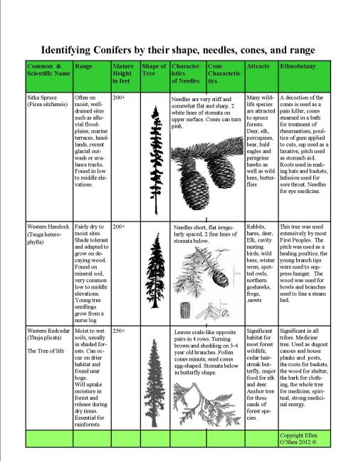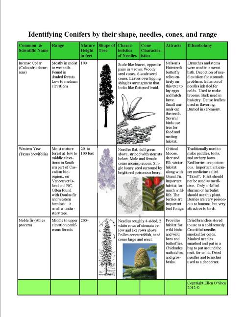 The trees I will be teaching you about are all found west of the Cascades. Later I will make some charts of important trees found east of the Cascades but still in the Cascadian bio-region. The charts below include information about what the tree needle, cone and general shape look like. This information should help you identify them. I have included information about wildlife that use the tree for survival and I have included ethno-botanical information about the tree. I have created some graphs that you can print out and make as large as you like. They are stored as graphics on this web page. I hope that you will print them out, take them into the forest and try to identify the trees as you walk. I hope that you will fall in love with the trees as I have.