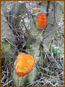 Alder is the common name of a genus of flowering plants (Alnus) belonging to the birch family Betulaceae. The English name was derived from the bright rusty red color that develops in bruised or scraped bark. The outside bark is mottled, ashy-gray and smooth, often draped with moss. But just inside is the glorious red used for dye and medicine.