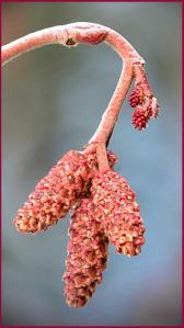 The flowers are catkins with elongate male catkins on the same plant as shorter female catkins, often before leaves appear; they are mainly wind-pollinated, but also visited by bees to a small extent. These trees differ from the birches (Betula, the other genus in the family) in that the female catkins are woody and do not disintegrate at maturity, opening to release the seeds in a similar manner to many conifer cones. The catkins form in the fall, and then overwinter, ready to open or flower in spring. The female catkin is cone-like, droops slightly, usually in clusters of threes.